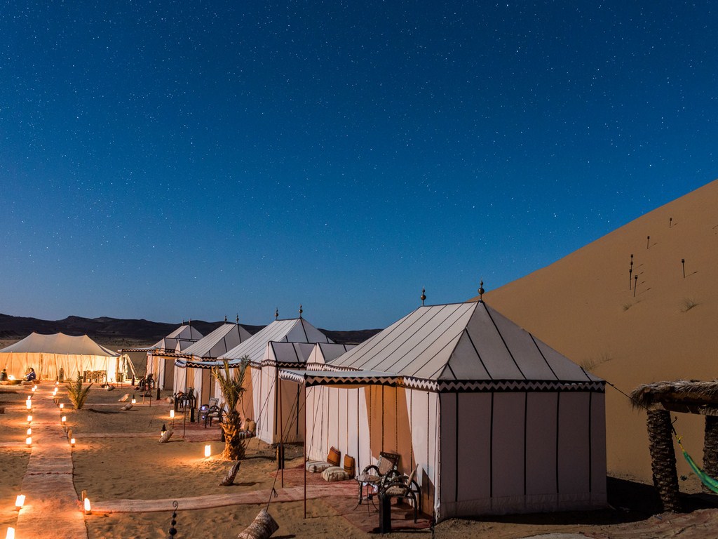Today and after breakfast, we will go to the desert, crossing one of the tracks that were used in the “Rally Paris-Dakar” to enter and learn how the native people live in this area and sharing with them a tea, the door of the great Sahara desert Where we can enjoy breathtaking landscapes and contemplate how nature is changing, the mountains leave a step to the oasis, and where out of nowhere appears a small town where time seems to have stopped, where people lead a simple life with the essential, surrounded by horizons of sand that never ends and a silence that says so much of these peoples. We will approach Khamlia a small town where black Africa has created its Gheto, there survive with their livestock and their lands and where we can enjoy a tea to the sound of their music, we will pass by the famous mines of Mifis, where the French extracted the Baritina, with spectacular views and proximity to the Algerian border will add to our stage today a touch of emotion. Finally, we will end our route through the desert with the visit of the oasis of Tissardmin where we will stop to see some very ancient sedimentary rocks that contain fossils of plants and animals that lived in that region. We will arrive at the inn about three in the afternoon to eat quietly, mid-afternoon we will be waiting for the camels to travel the high desert dunes and spend a night under a sky full of stars, you can see for yourself how the silence of the Desert, surrounded by miles and miles of fine sand. Enjoy the sunset in the middle of the golden dunes and spend an unforgettable Berber night enjoying a tea and a nomadic dinner, dinner, and accommodation in an unforgettable tent.