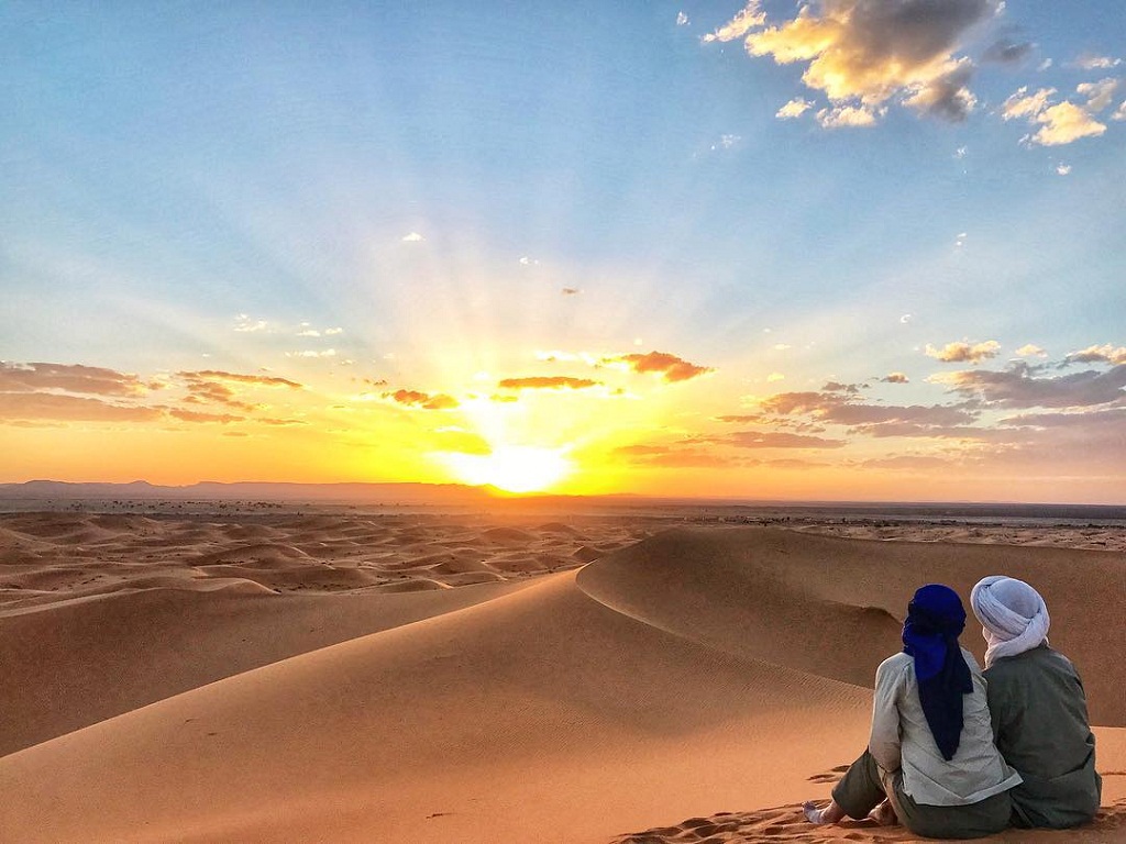 After breakfast, departure for Todra Gorges. You will then take the road to Erfoud through Tinejdad and several Berber villages. At Erfoud, stop to admire the remarkable fossilized marbles. The adventure will continue towards the big dunes of Erg Chebbi in Merzouga. You will abandon your vehicle for the benefit of the dromedary to reach your camp in the desert. The opportunity to witness a beautiful sunset in the dunes. Dinner and night under the tents of nomads. An experience to live at least once under a sky full of stars and in the extraordinary silence of the desert.
