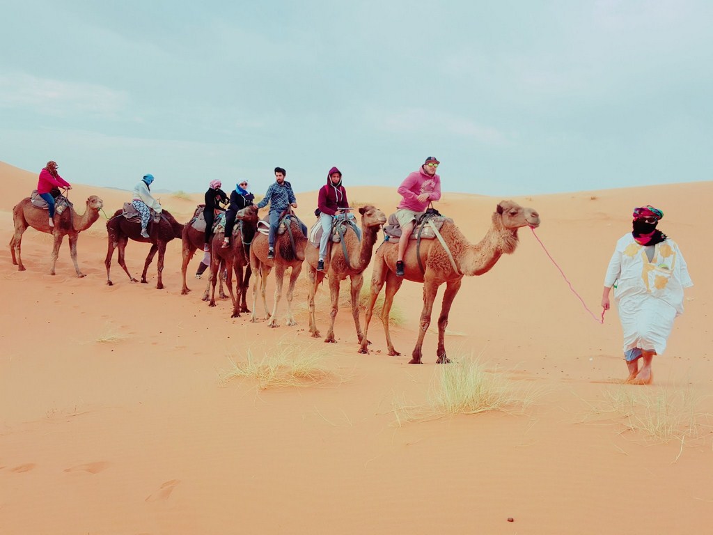After breakfast, we drive through Midelt which is famous for its apple tree farms. We will cross the eastern part of the High Atlas Mountains with a perfect view of Ayachi Mountain with its snowy peak in winter. We cross Errachidia and the palm tree filled oasis of the Ziz Valley. Continue to Erfoud and Rissani where we visit the local souk. You will arrive in Merzouga where we will start the camel trek out across the dunes to our desert camp. We stay overnight in tents, and we will enjoy dinner near the campfire with music and song under the blanket of stars overhead.
