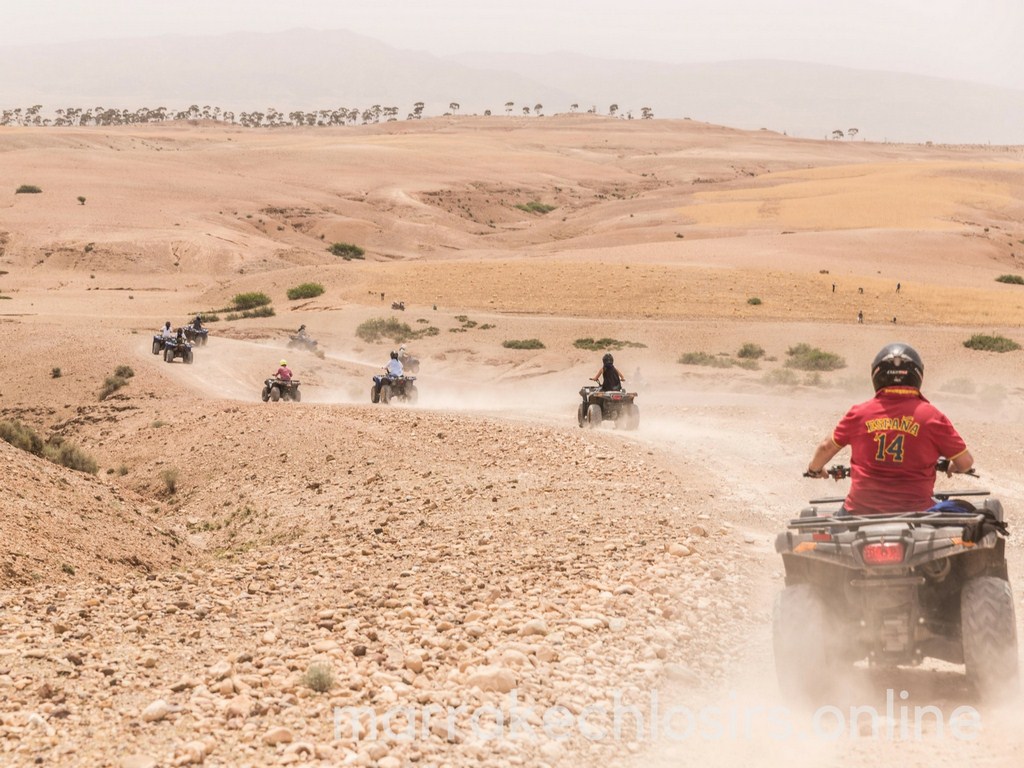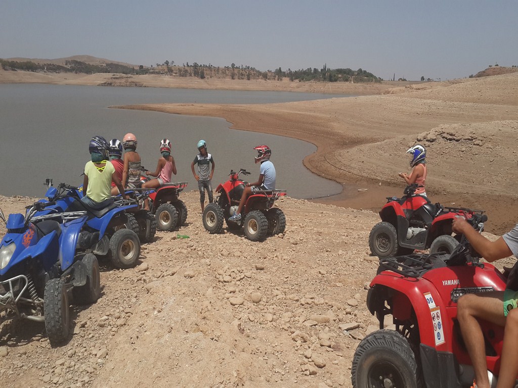 You will start the itinerary of half-day quad biking tour at Takerkoust Lake dam with a meeting with the driver who will pick you up from your accommodation (hotel or riad or any point in Marrakech) in the morning or afternoon. You head to Lala Tekerkoust Lake, 35 km far from Marrakech. Along the road, see the beautiful, harmonious nature before you arrive at Lalla Takerkoust. Listen to a briefing on the safe use of the quads, then receive your equipment. Begin your tour and leave Lalla Takerkoust towards the wild valley of turtles and desert plateau, rushing into the High Atlas oases and wadis. Enjoy a breath of fresh air in the Atlas region. Discover small Berber villages and take the opportunity to meet the wonderful local people. Stop on the Kik Plateau to see an extraordinary panorama view over the artificial lake, which is 7 kilometers long. The blue waters spread until the foot of the Atlas. Here, you can enjoy a delicious mint tea while soaking up the view at Berber family house. Return along another track, then be collected for the drive back to your accommodation.